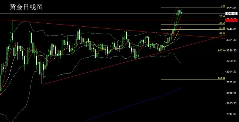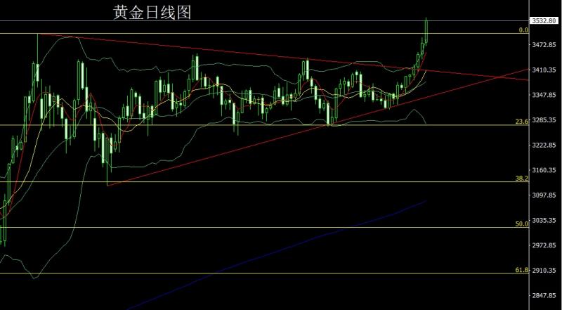 昨日黄金市场早盘开盘在3478.3的位置后行情先拉升破位历史高点3500后给到了3509.2的位置后行情短期获利了结回落,日线最低给到了3469.7的位置后美盘时段受到基本面推升行情强势拉升,日线再破历史高点后最高触及到了3540.6的历史新高后行情整理,日线最终收线在了3532.6的位置后行情以一根上下影线等长的大阳线收线,而