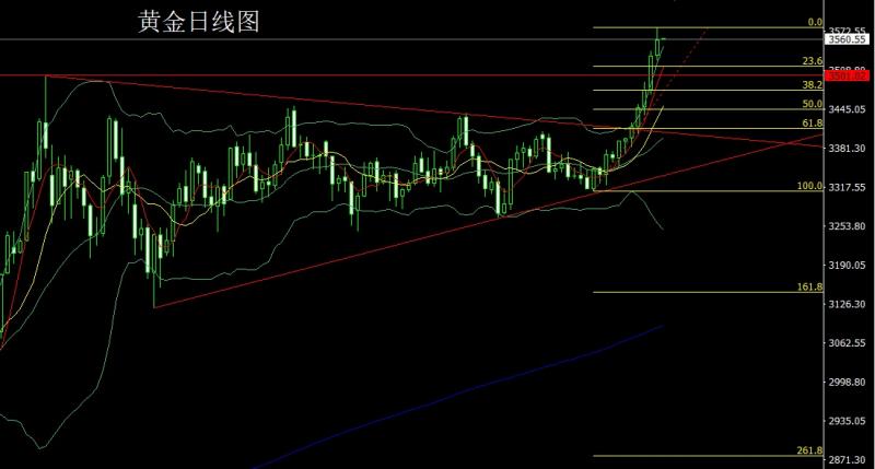 昨日黄金市场早盘开盘在3533.8的位置后行情先小幅拉升给出3547.2的位置后行情震荡回落,日线最低给到了3525.7的位置后行情区间整理,美盘时段行情破位3550压力后最高触及到了3578.6的位置后行情整理,日线最终收线在了3559.1的位置后行情以一根上影线很长的大阳线收线,而这样的形态收尾后,今日的行情依旧有看多需求,