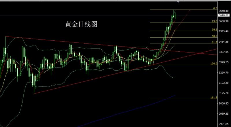 昨日黄金市场延续拉升趋势,早盘小幅低开在3580.2的位置后行情回落给出3578.1的位置后行情强势震荡拉升,破位3600的整数关口后行情快速拉升,美盘时段日线最高触及到了3646.7的位置后行情整理,日线最终收线在了3635.2的位置后,日线以一根上影线较长的大阳线收线,而这样的形态收尾后,今日的行情依旧有看多需求,点位
