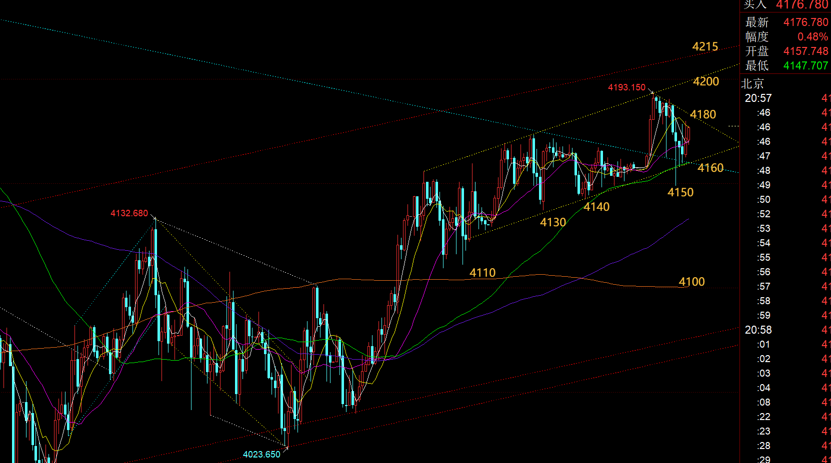 郑氏点银:黄金4192直接越过,次高点延续至下一个4275 回顾昨日行情走势及出现的技术点: 第一,黄金方面:昨日早间冲高回落,大阴失守小时线10日,则代表逼空结束,展开回调震荡修正,则4121跟随一波看跌下行,最低触及4098逢低拿下;由于当时连阴走的形态可以,午后反弹依托小级别顶底