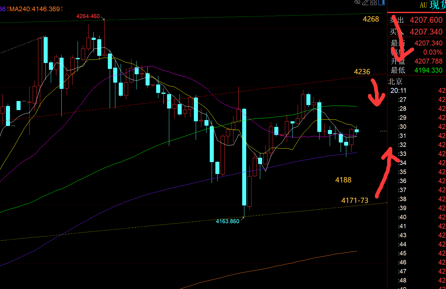 郑氏点银:黄金震荡慢跌失守4200,今晚先看二次打压 回顾昨日行情走势及出现的技术点: 第一,黄金方面:昨日差点被多空杀,节奏没把握好,主要是出现两个问题,可能是大部分人都会犯的:①,当短线有了利润,比如昨日4238震荡看涨,最高拉升4247,有了9米利润后,没及时上移保护损,最终反而