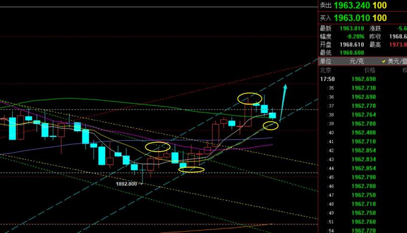 第一,黄金日线级别:由于这两日的回调力度稍有所偏大,触及了前一根大阳一半实体位置,因此对上行通道做了一定修正;那么从图中看,下轨指向刚好重合10均线处1956-57一线,而我们知道,前面价格是一路延续5均线小单边强势上攻,首次试探10均线附近一般会有企稳动能,至少前高还会再次摸一次;另外,处于10均线上运行,走势也是处于逼空拉升中,看涨趋势不受一点影响;预判金价受10均线支撑企稳后,这两天短暂的回调马上会被终结,继而回归上行通道内继续运行破高,而上轨指向至少是2000-2008区域,仍可耐心等此目标;