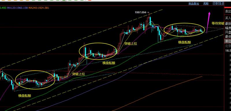第一,黄金日线级别:昨日收报一根下影线阴K线,作为一波拉高至1997后再次出现的高位修正,仍处于5均线上运行,则强势单边格局依然不变;今日5均线支撑上移1970一线,只要收盘处于1970上盘整,一般两三个交易日后,则会再次强势推动破前高,再上去就基本去冲破2000关口了;