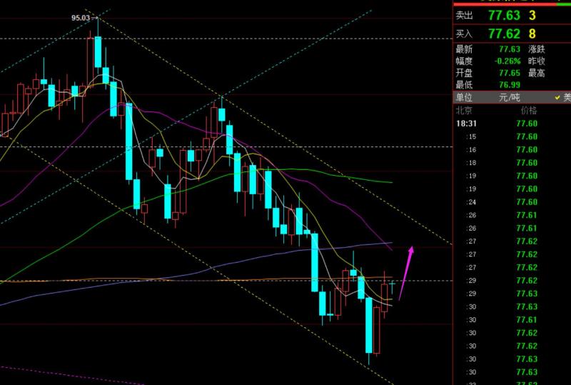 第三,原油方面:昨日计划回踩依托小时线中轨去看涨,认为日线企稳通道下轨,大阳出现后,本周初有望逐步试探上轨81,可惜走的比较强,一路逼空向上,不给机会;