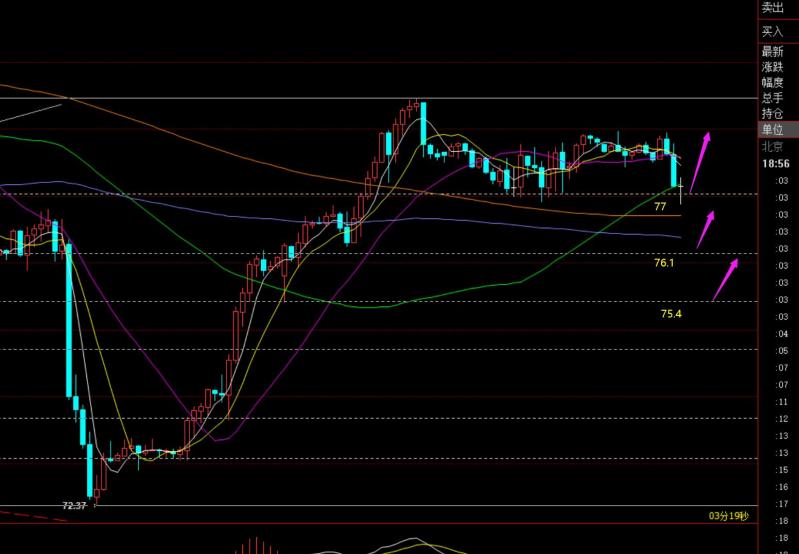 原油方面:日线级别处于短期5日和10日上方运行反弹,关注它俩支撑的企稳,能处于它们上方运行,则短期还是会进一步的上攻拉升,去测试下行通道的上轨阻力81-82下,具体位置随时间周期会变动;同时,图中小时线级别,高低点分割来看,77、76.1、75.4这三处支撑要留意企稳信号,76.1上也是日线短期均线支撑;