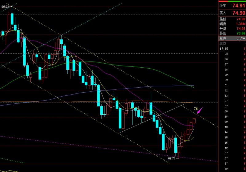 原油方面:日线这几日连阳持续走高,有单边的味道,重点是周线年均线68撑住了,而前期5月份就是守住年均线65,一路走高至最高95,这一次是否是二次单边中期拉升呢,拭目以待;日线级别上,有一个重要的承压点就是下跌通道的上轨76,一旦突破站上,则弱势下滑阶段告一段落,将展开逐步的一轮上攻;今日的支撑点在73.,此位置上拉低继续看涨反弹为主,当前离价格有些距离,可能晚间会提前试探;