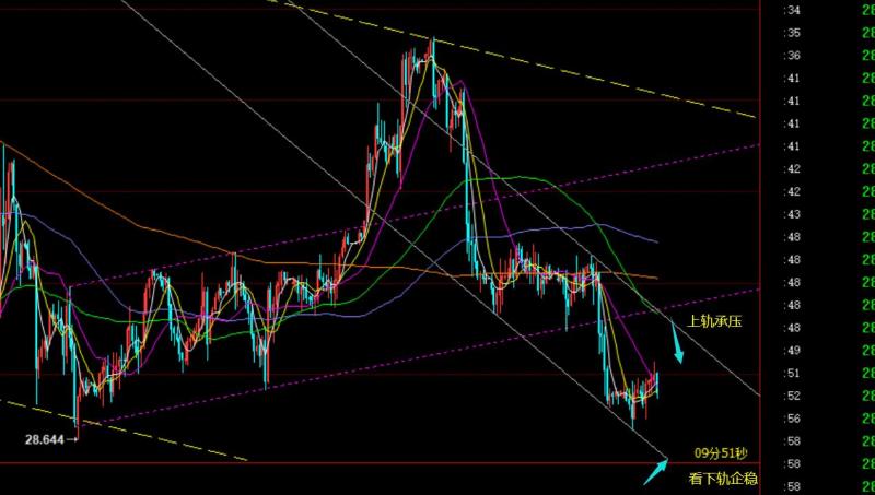 白银方面:昨晚也是有效下破了前几日的上涨通道,那么29.3下方逢高就是顶底转换压制点,先靠近29.3-29.2可看跌回落;图中下轨支撑大概指向28.5上下附近,触及看企稳反弹,留意这个区间内先运行看待;