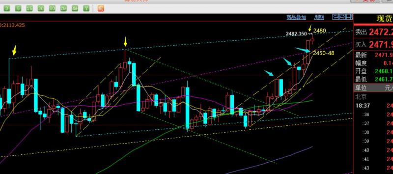 第一,黄金日线级别:昨日饱满大阳,收盘有效突破站上这几周的上行通道上轨2438,同时站上前期通道的反压点阻力2446,意味着后市将有望进一步打开更大的上涨空间,也有可能将步入单边趋势的第二阶段-----连阳强势上冲;今日早间直接续涨一波,高点触及了前期4月12日和5月20日两高点所连接的趋势阻力线承压点2480一线,此处将是接下来能否步入趋势第二阶段的关键;若今日强行连阳,收盘站稳拿下2480位置较远,那么两根大连阳的格局一旦产生,其发挥的单边上拉威力将会持续,空间不可限量,不能去猜顶; 反之,无法站稳它,承压了,那么可能会回踩确认2450-2448一线再寻求企稳;