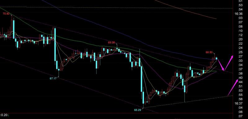 原油方面:从图中看,连续几日压制的关键趋势线被上破了,欧盘首次出现了强劲拉升,今晚倾向于回踩确认继续看涨反弹,关注67.5支撑,以67作为风水岭;若出现洗盘失守67,再等待66上尝试一次反弹,阻力目标69,也基本是靠近日线10均线,若能站上它,超跌反弹也极有可能发生;