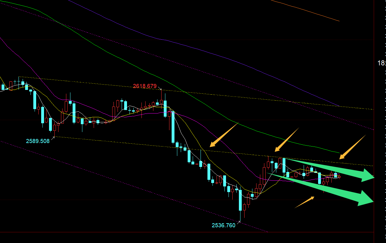 第一,黄金方面:昨日直接延续前日的抛售,最终抵达2550日线级别前期通道下轨一线,那么前日安排的2617下看跌波段,也就顺利完成收割;之后欧盘期间见15分钟出底部阳包阴,又刚好企稳于2550,则安排了2554轻仓试探反弹,跌幅过大,总要出现一波拉升来修复严重的底背离和超卖指标,但18点收线那一刻不幸遇到了资金盘砸盘,瞬间刺破2554,触及2790高点压制以来下跌通道的下轨支撑2536,由于欧盘进一步打压走弱,即便15分钟反复出现多根长下影K,也不敢再急于出手试探,结果美盘并未二次压制,而是一路慢阳走高,这个走法其实和上周2643拉升至2710一样,出现了看似力度偏大的反弹,结果又被打压原形,仅仅只是反弹;因此,观察通道反压点可知道2577一线有压力,美盘一直观望,直到承压2577后,才安排2574跟随看跌,最终成功打压,耐得住寂寞,才能守得住繁华;