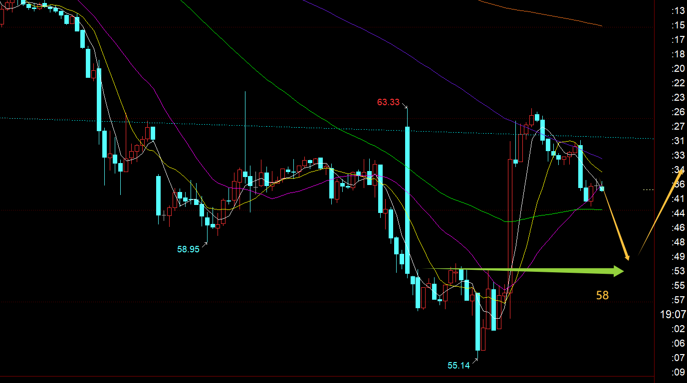 原油方面:62一线依旧存在通道反压,站不稳此处,则继续看压制进行底部整理,支撑58顶底位置,今晚留意此区间;