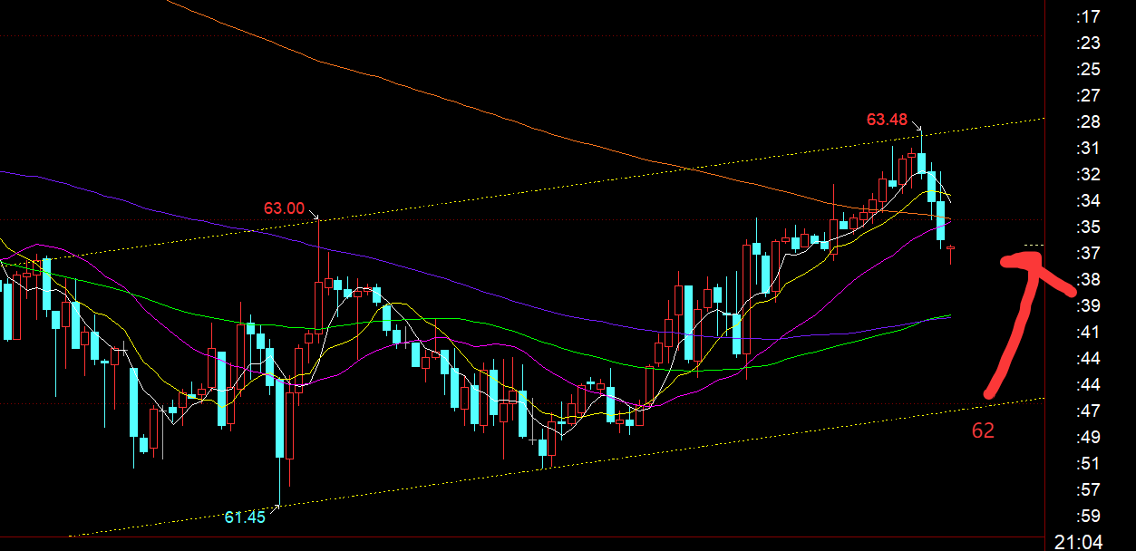 原油方面: 日线10均线压制还在,还未有效突破,仍不宜追涨,同时上图通道上轨刚好日内压制下滑,今晚关注62下轨支撑,触及企稳看反弹;上轨63.5一线二次先拉升压制不过,看回落,震荡对待;原油被一路压制下滑太久时间,还未出现过好的超跌反弹修正,因此倾向于等拉低看涨反弹;