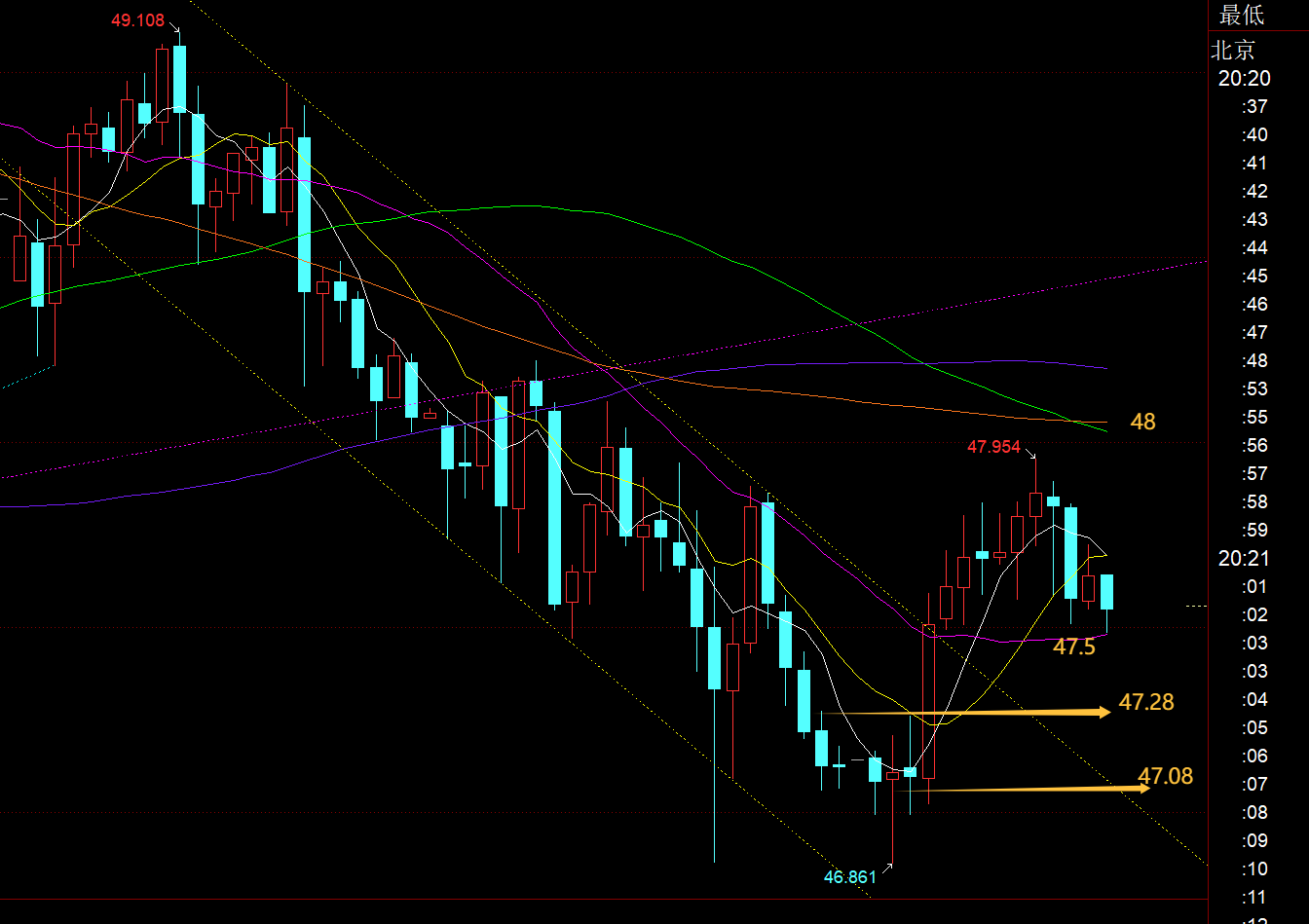 第二,白银方面:昨日亚欧盘整体震荡慢下行,走的也非常坎坷,反复性很强,最终下跌至46.8一线,靠近周线10均线上支撑稳定探底拉升,后半夜收盘前又冲高回落;