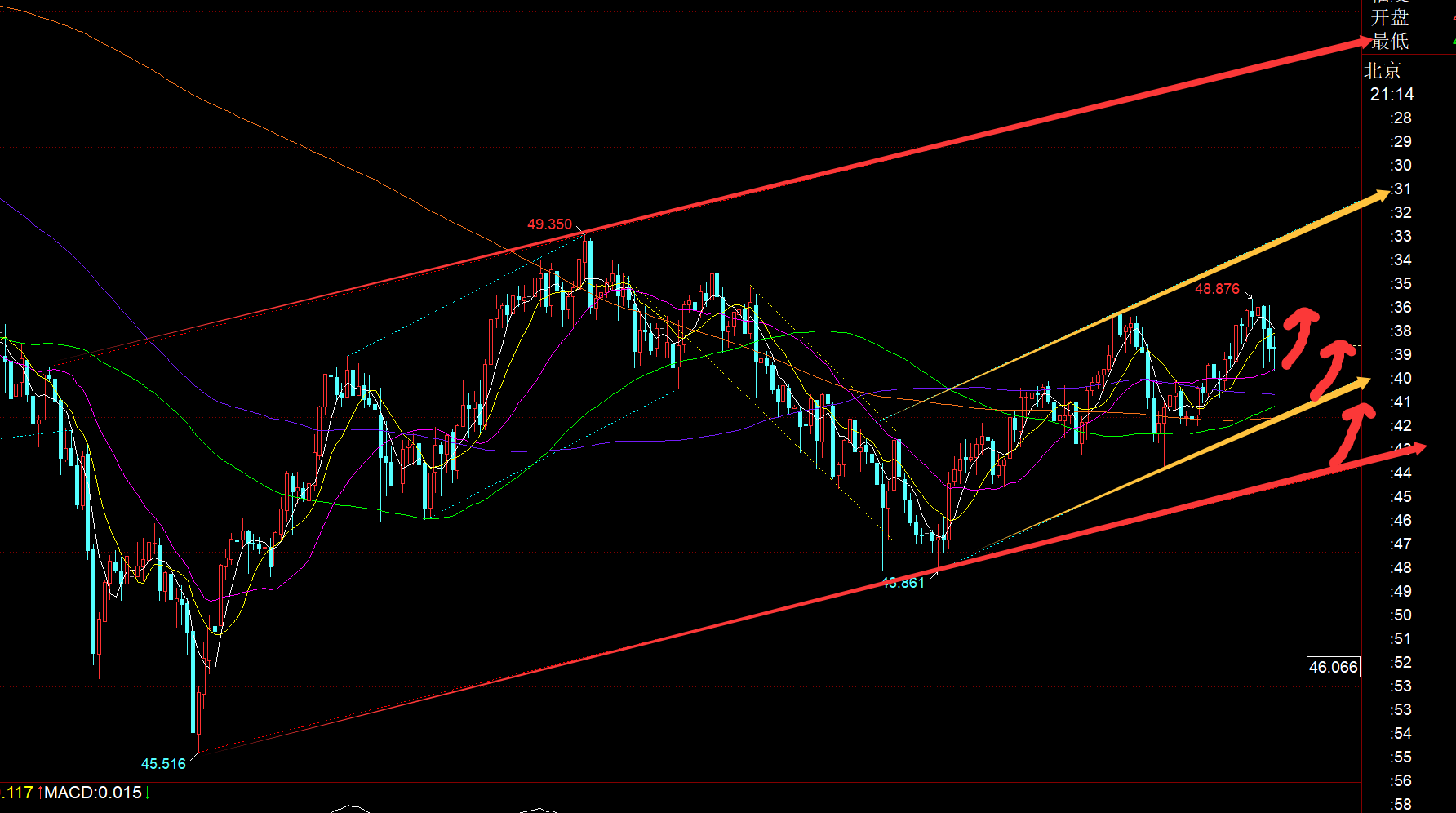 白银方面:从上图看,同样处于红色大通道上行通道内整理,而小通道就是黄色上行整理,当前小时线中轨支撑48.35上,日内618分割支撑是48.3,先留意它的支撑企稳; 而黄色通道下轨支撑是48,此位置上也存在企稳反弹,若再弱一点,就是红色通道下轨支撑47.6; 所以,对于震荡而言,今晚留意这三处的支撑企稳信号,出探底拉升K或大阳K,则下一个小时回踩就可尝试介入试探,阻力48.85 和49.4;