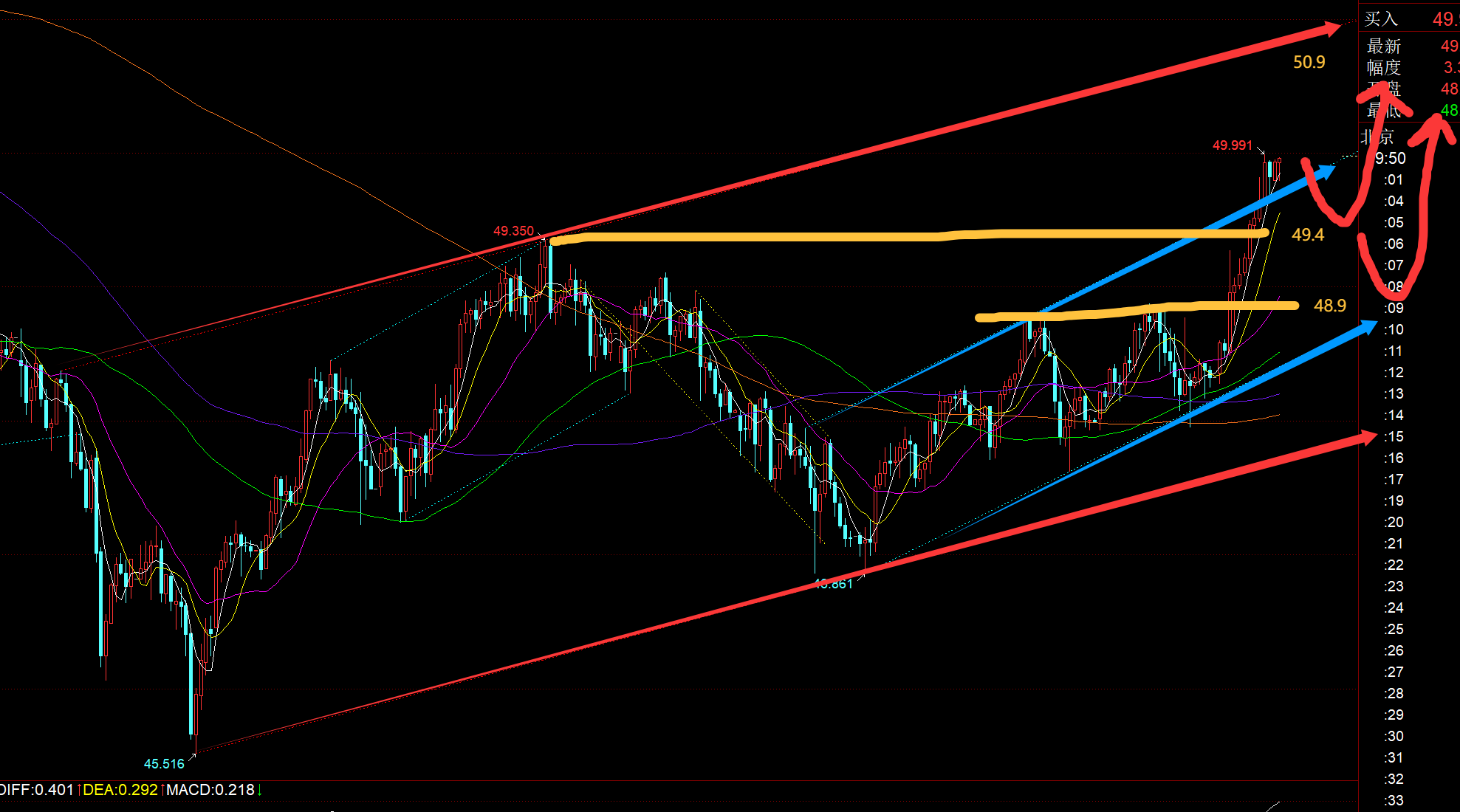 白银方面:今日也是大幅拉升,目前是有所突破站上49.4关键阻力位,还需看今日收线来明确;只要日K收盘站上,那么至少会产生次高点冲击51一线,其次是52.5; 当前从上图通道看,49.65上支撑,若失守此处,则重点留意49.4顶底位置,和48.8-48.9,接近日内618,以及前两日的顶底;拉低企稳继续看涨为主,再往上冲击的目标阻力是50.9-51;