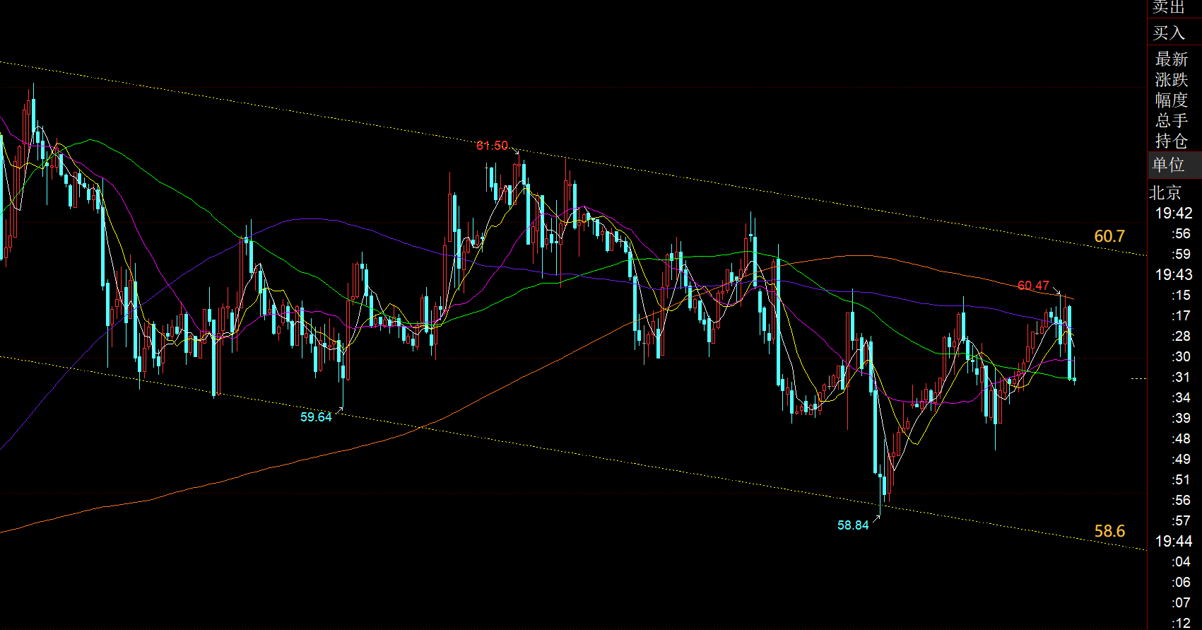 原油方面:没啥太大波动,继续黄色小通道内震荡对待,上轨阻力60.7,下轨支撑58.6;