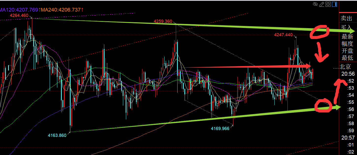 今晚总体上,只要价格维持于红色通道上轨4294之上运行,就看涨为主,不去试探空,因为它已经脱离了前面的震荡区间,不能再按震荡来对待,趋势来了就按趋势去对待,阻力能看到的就是4370-4381前高区域了;