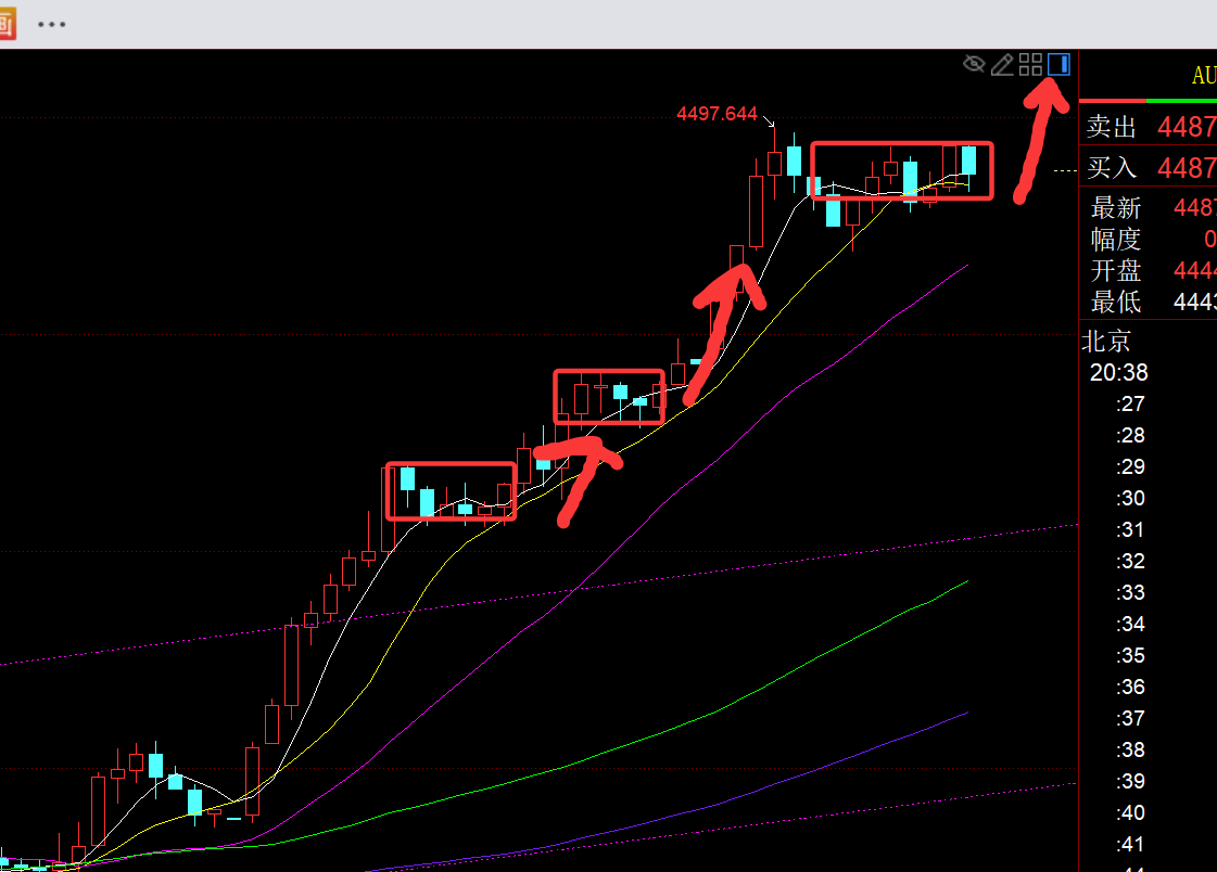 第一,黄金方面:昨日早间直接拉升,单边趋势,早起都有肉吃;午后和欧盘依托4470上、4482上反复看涨,也反复试探4493,逼近4500下压力目标;而美盘再依托4476上看涨,出现一波急跌洗了下,后半夜企稳4430又连阳V拉升回到4500关口,收盘于相对高位,停盘前就直接提示,今天一早开盘可以直接继续博续涨,胆大才能吃肉,强势趋势单边不光靠技术,也靠胆量,做好风控即可,4490直接看涨,4520-30到位;
