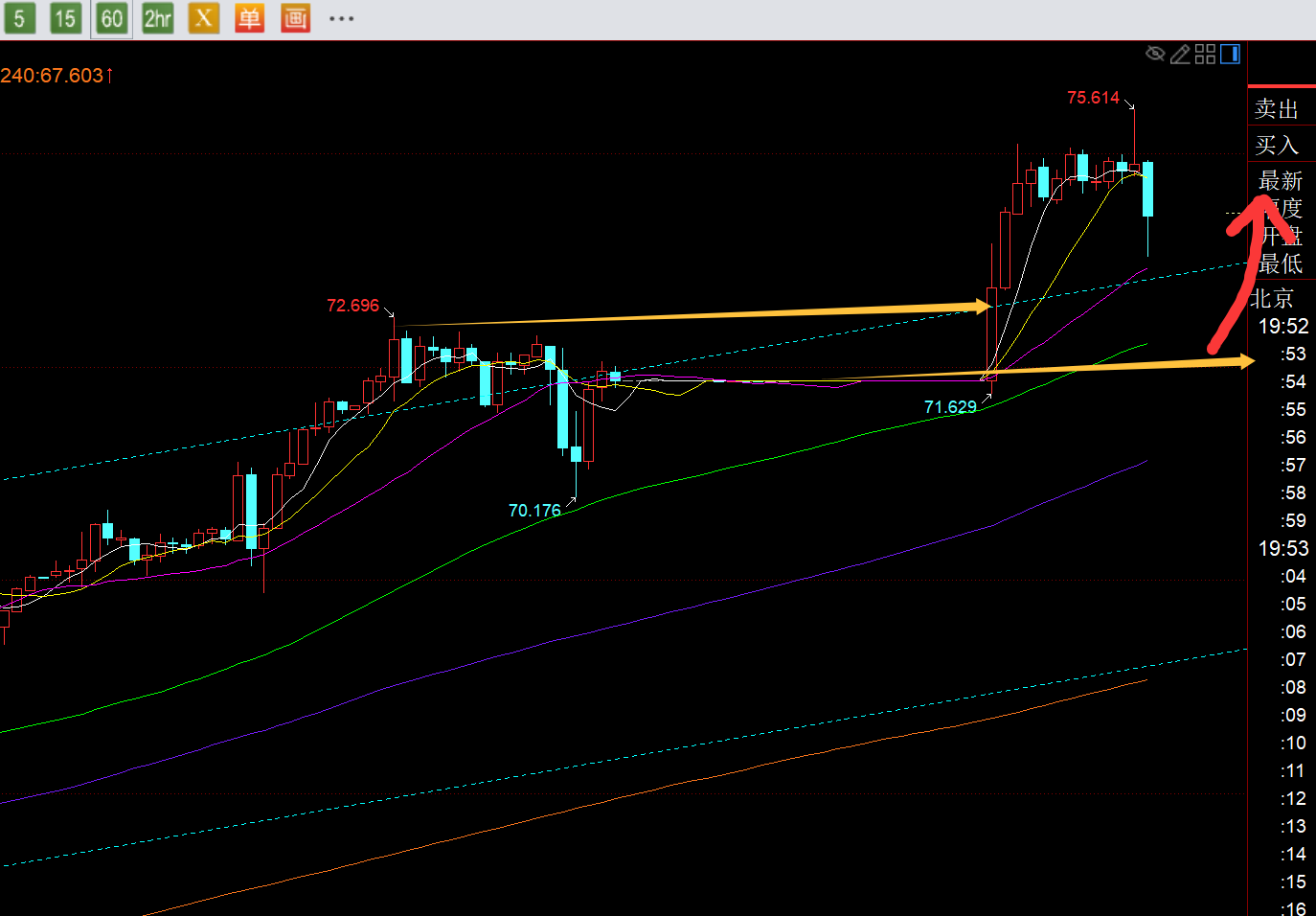 第二,黄金小时线级别:上图就是把刚才日线级别所讲的规律给详细图解,一波单边拉升走高,再伴随相对高位的区间来回整理,再继续一波单边趋势走高,再整理,再单边上拉;另外时间节点也很有规律,比如亚盘开盘7点至10点基本都是连阳强势续涨破高,欧盘基本都是陷入横盘,美盘22点之后出现一波急跌下探,凌晨前后企稳慢慢V走高,也就是日内会经历两轮洗,美盘先把亚盘涨幅洗回去,半夜收盘前再把美盘跌幅洗回去;并且幅度上也有一定规律,跌幅一般60-70米就是相对出一个夜间低点,因此今晚凌晨前后留意4470-4460上企稳,也是围绕日线5均线,继续顺势看涨,一旦后半夜继续慢慢V走高,下周一早间又可以尝试博续涨,再突破4530,就应该很快去试探4569-4577;规律并未100%,它也可能提前企稳,看到出底部探底反阳K,饱满那种,就是信号;