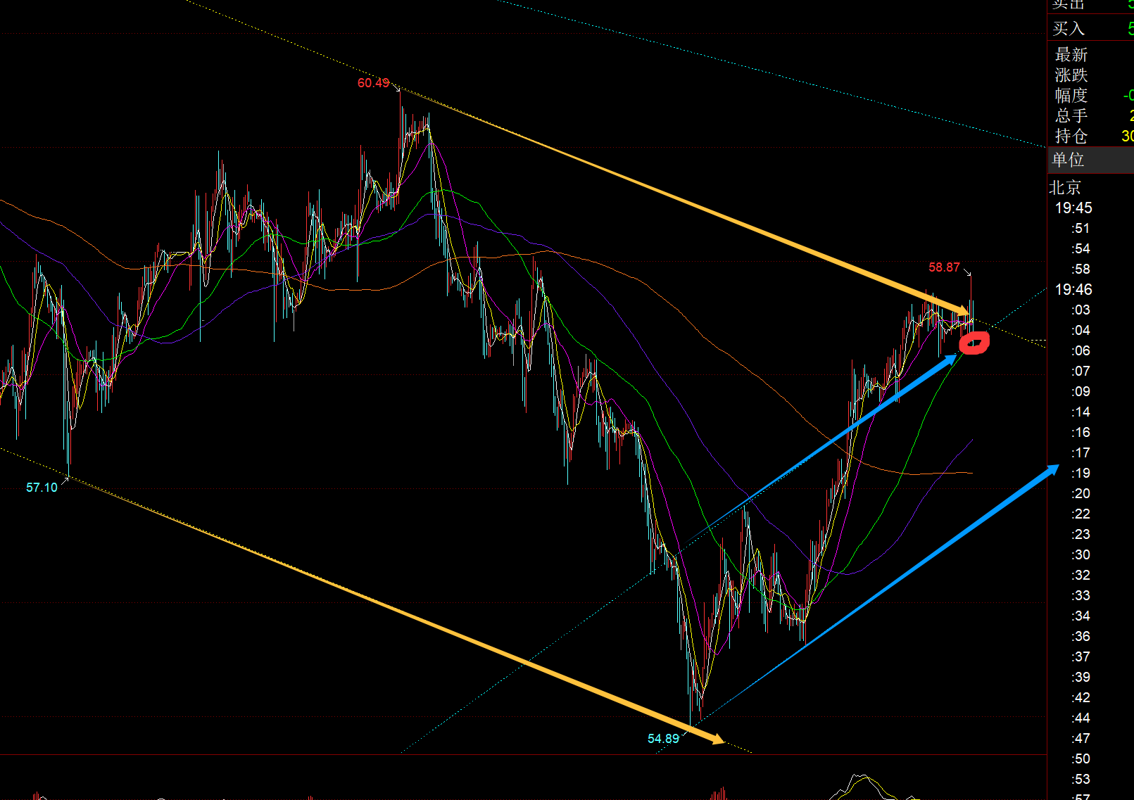 原油方面:这两日波幅是不大的,它就是在测试黄色通道上轨以及蓝色通道上轨得失情况;目前黄色通道上轨持续有承压,今天向上击穿了下,但很快冲高回落,今晚看蓝色通道上轨支撑如何,若有效破58.1下行,也是日线中轨位置,那么就按蓝色通道内来进行,下方就可以逐步指向下轨位置;未有效打下去,就继续耗着等待磨时间;上方还有两大阻力,59.4和60,能触及可以尝试逢高看跌;