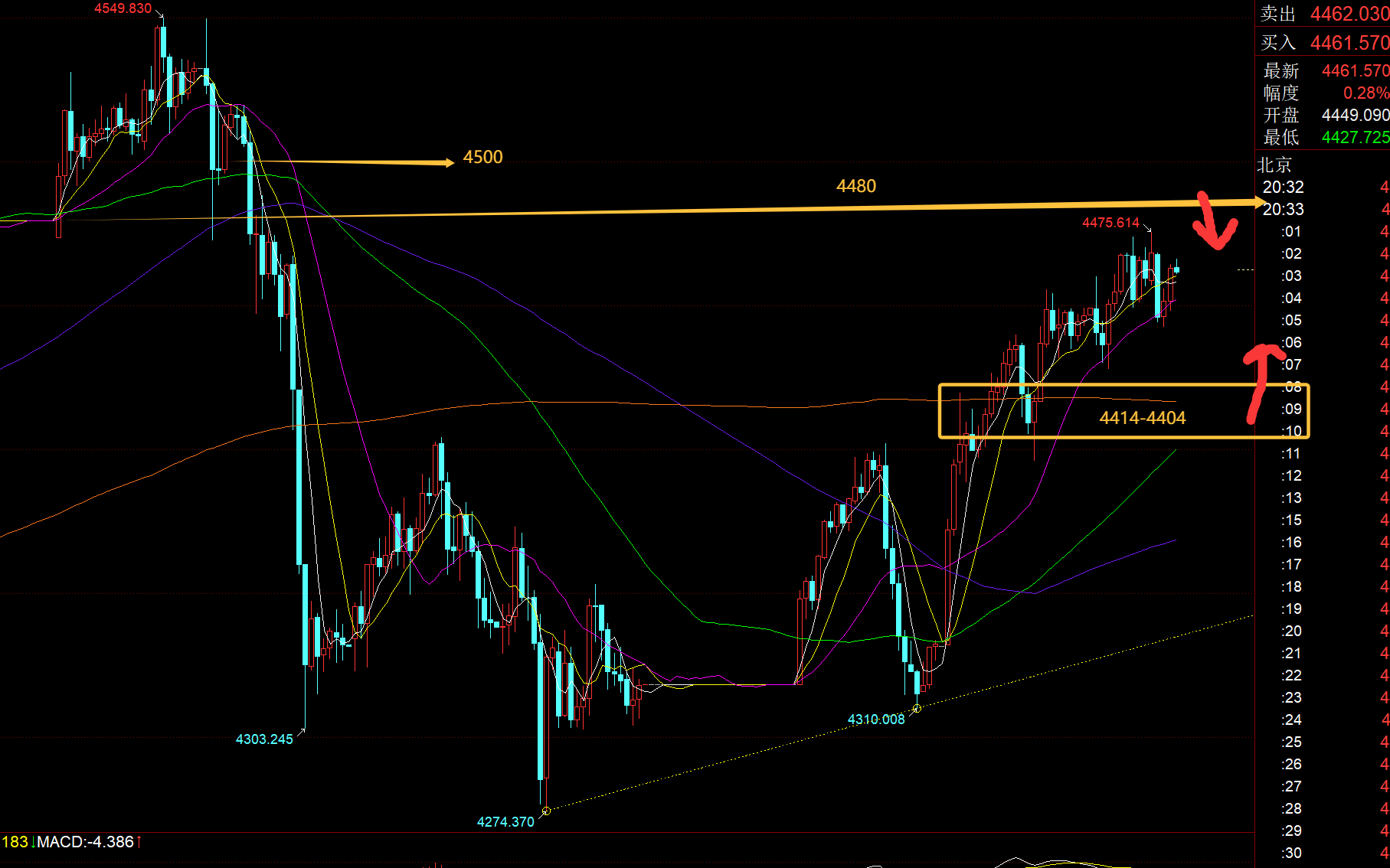 第三,黄金小时线级别:今日亚欧盘整体的走势就是震荡抗跌慢上行,但走势相对缓慢,由于波动率前期的放开,即便走的慢,每一个小时K也都有至少10米的波幅,因此位置稍微没卡好,依然容易会导致被出局,尤其是这种震荡反复的走法;由于短周期macd处于严重顶背离,今晚向上拉升,尤其是破日内高点,是很容易加重背离,而出现冲高回落打压修复;因此4480及上方要留意冲高回落的动作,中轴是中轨,若失守则下方留意年均线和66日均线,基本集中4404-4414,也是靠近日线10均线,只要敢下滑,就是不错的北上低位时机;