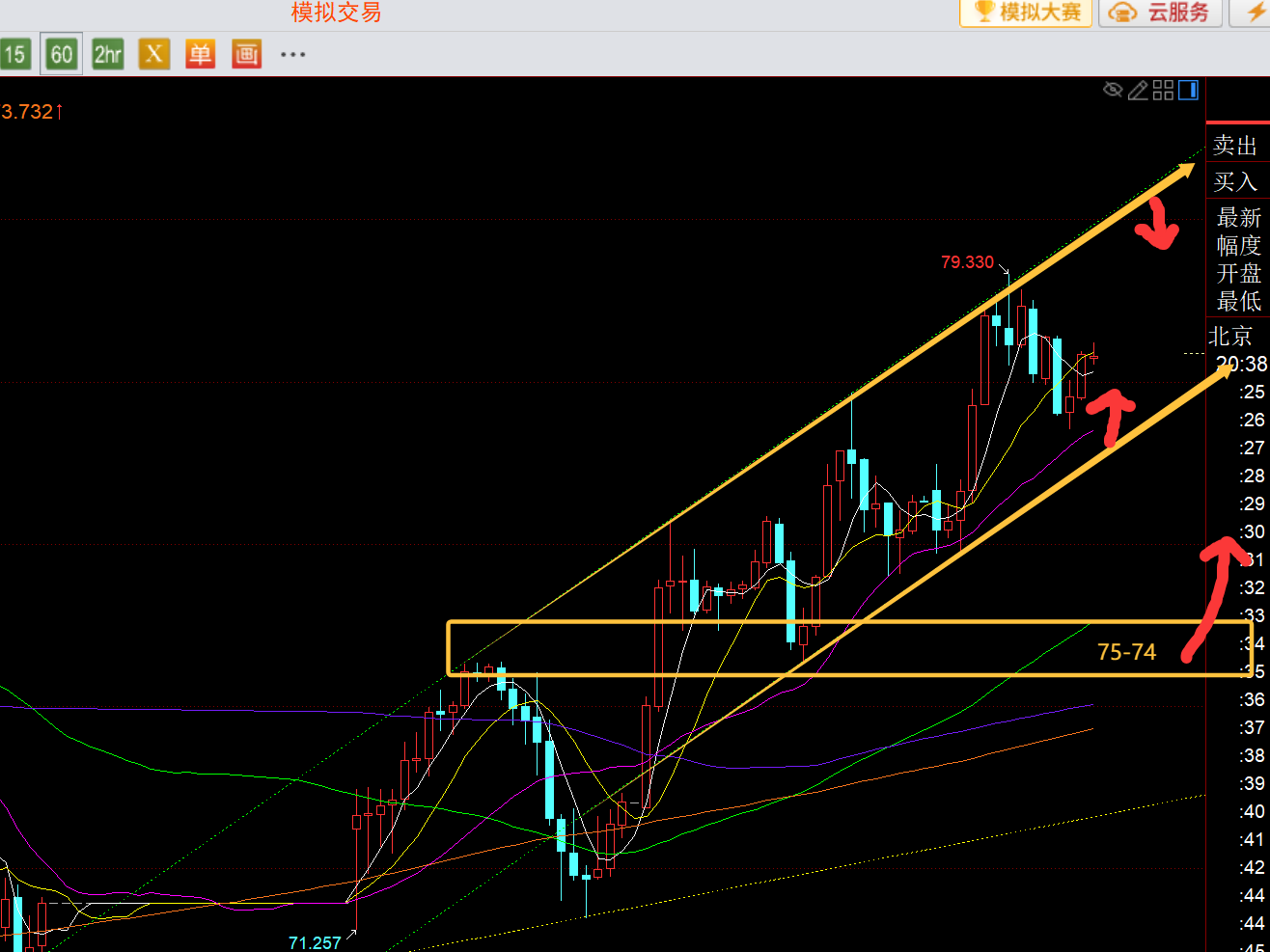 第二,白银方面:上周安排70、75两处波段看北,昨日先75之上调仓相对偏高的位置,70性价比相对好的,也是这轮调整最低点,就安心趋势持有;