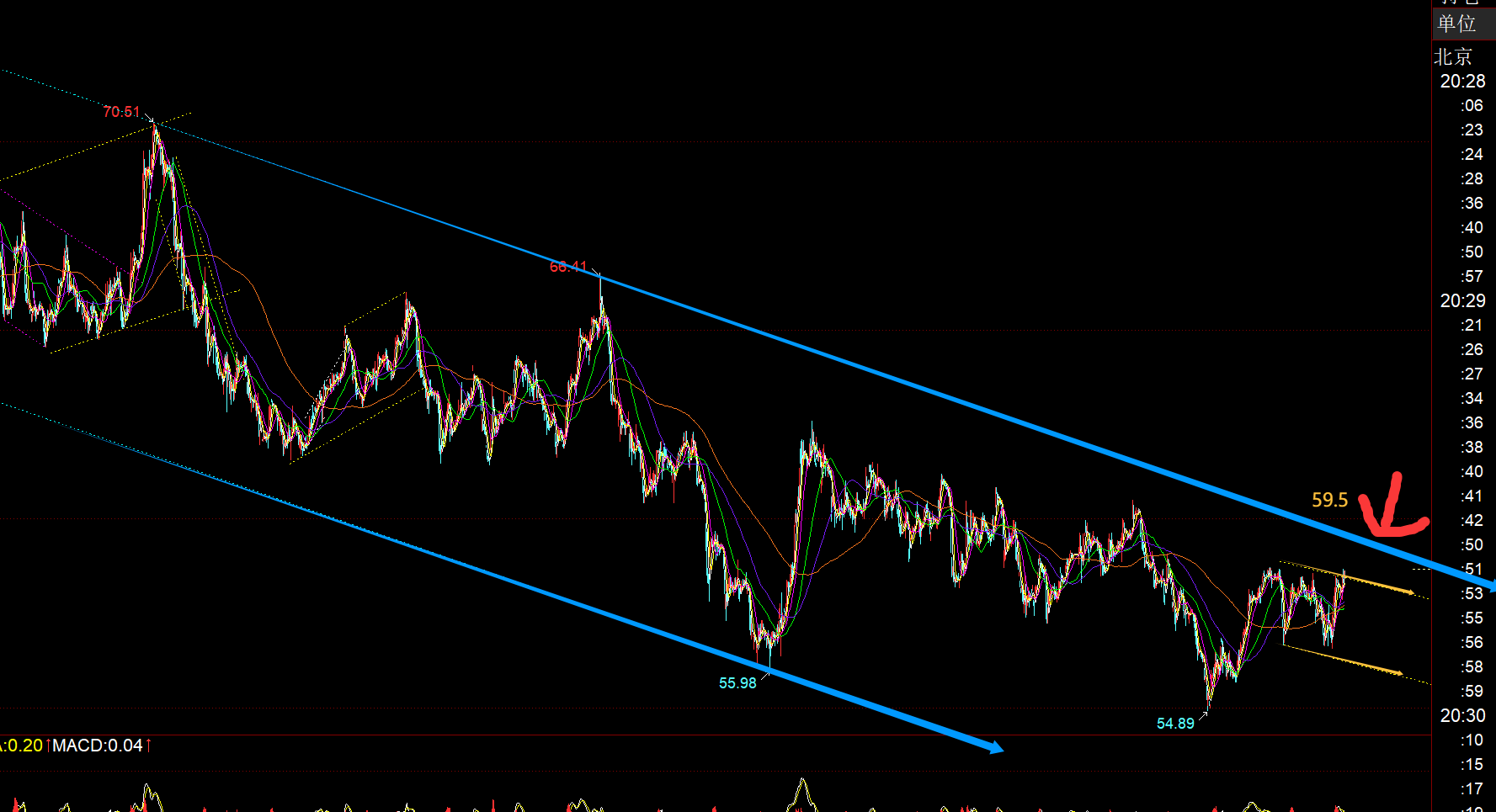 原油方面:日线通道上轨和66日阻力依旧是59附近, 图中小时线级别通道上轨59.5阻力,短期内这两处的通道压制依旧是关键,冲不过去,则还是弱势,还要继续通道内反复的整理;