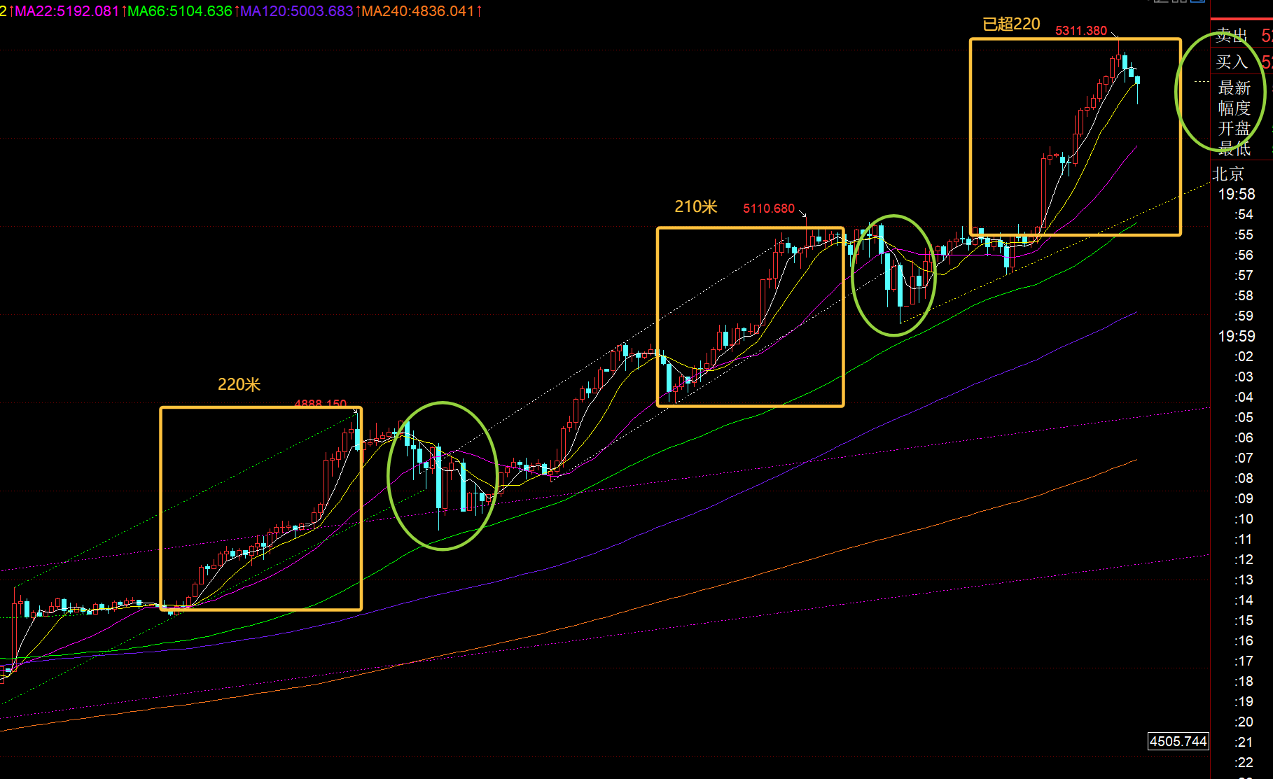 第一,黄金方面:上图是小时线走势,可以看出一些规律,黄色框属于这几日每一波的持续涨幅,大概平均220米;而绿色圈属于震荡回调,回踩的低点基本是黄色框涨幅回调的50%和61.8%之间;而这次涨幅早已过220米(5046低点来算),若今夜还能继续强拉破新高,那么按5157低点来算,那么220涨幅,对应的高点是5377左右;所以要看今夜老包讲话之前,是否维持相对高位整理,还是继续上攻; 那么若按5046低点来算,5311高点附近能横盘压制的话,那么今夜按规律回调的位置大概锁定5150-5170范围,先尝试看这种,毕竟今日已经涨幅160米,再往上强拉难度也有所偏大,看能否高位步入一个区间内横盘,来等待后半夜美联储利率公布消息,市场预期是不降息,重点看老包能否给惊喜,给市场泼一下冷水,降降温;  当然近一点的支撑,就是今日涨幅回踩的几个分割位置,比如50%5234、61.8%5216,而5216预计也会逐步靠拢小时线中轨,它是此周期强弱的标志,若有效失守中轨的话,那么就意味着调整会扩大;强支撑则是日线5均线,大概5050-5070范围,触及也是不错北上位置,适合波段;