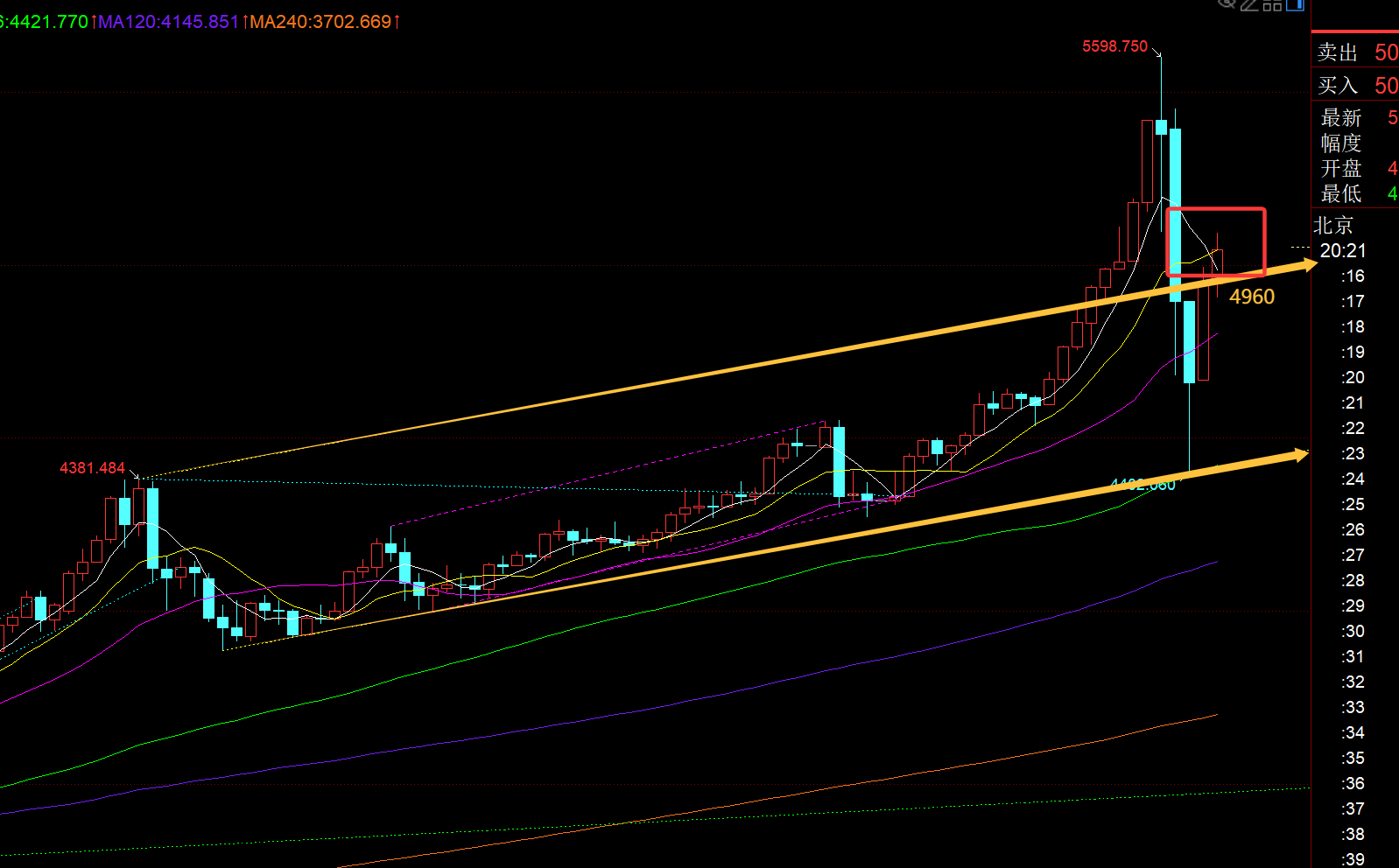 第一,黄金日线级别:昨日刺穿10均线5035阻力后冲高回落,收盘未站上,则意味着暂时无法直接走强,且价格也重新打回昨日提及的上行箱体通道内,未来几日时间或围绕中轨进行往复整理;按照前期4380、4245、4550每次出现短期的承压,都是快速一步调整到位,之后都会经历一两周的相对底部整理酝酿,低点逐步上移,或箱体,或收敛三角,最终再上破阻力位进行牛市趋势延续发展;今日中轨位置上移4817一线,后续几日看每日的收盘价格,若一直处于中轨之上,那么最终很快会向上突破走强;若后续几日处于中轨之下,那么会多震荡酝酿些时间,最终也会向上突破;就当下而言,4403依然先判断为短期底部,大级别四浪回调的低点,现在就是进行第五浪拉升(最终会看好下一个趋势目标6053-6167),而五浪中会产生很多子浪,伴随着震荡修正,需耐心等待;