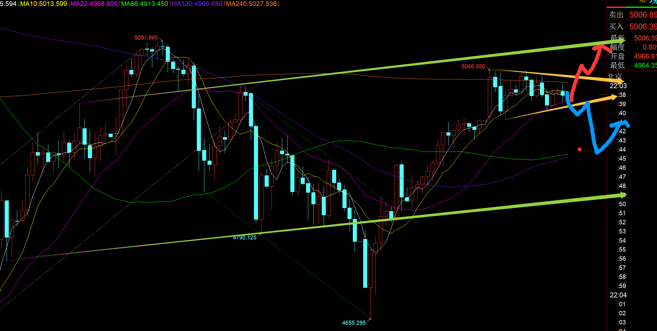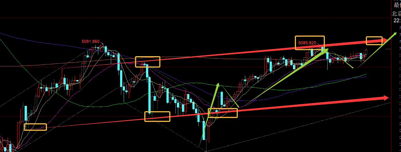 第二,黄金小时线级别:从上图看,昨晚拉升的高位刚好触及了红色通道上轨,这也是隔夜给的目标所在;为什么不去反手呢,很简单,因为日线看好上破,即将迎来一波强势上冲,上方就还有至少三四百米,遵守顺势原则,一路回踩北上为主,如此才能不迷失方向,高位不会犹豫或恐高而不去跟随北上(如果你认为它会跌破4900、4800等,那么5000上方的任何价格自然是不敢或不会去北上的),也如此才能把握住相对好的北上底仓波段大肉; 一早跳水一波,完全不慌,因为它并未跌破4980,而高位震荡中,一早延续性都很差,急跌就容易马上反补,所以一早出门前就提示5010逢低可继续北上,最低5009刚好触及拉升;午后和欧盘一直处于5020-5060区间内整理,横盘是为了逐步修复短周期macd,促使它靠近零轴或零轴下方,削弱空头力量的同时不断积累多头动能,最终就容易向上发力突破,现在破了日内高点就是结果;接下来5010的上方等企稳仍可北上,通道上轨上移至5105左右,也是今夜的目标位,当然速度墨迹的话可能等明日了,因为今天整体上都在处于慢震荡中,市场或等待明晚非农来刺激,以及周五cpi;