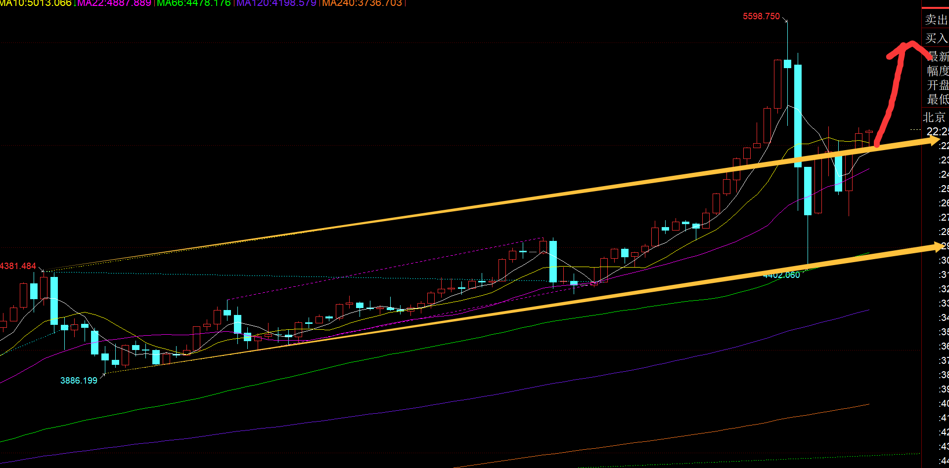 第一,黄金日线级别:昨日虽收小阳K,但出现两个关键信号,它不仅突破了图中黄色通道上轨阻力位,收盘也有所站上10均线,这就加大了黄金随时再次走高试探前高的动能,至少会拉一个次高点5400;且看今日收线表现,一旦仍收盘于10日上方,最好收盘离10日远离些,那么就是相对明确的突破站稳信号,后续就容易出现连阳强势发展;因此今日10日5010的上方都是维持继续北上为主;