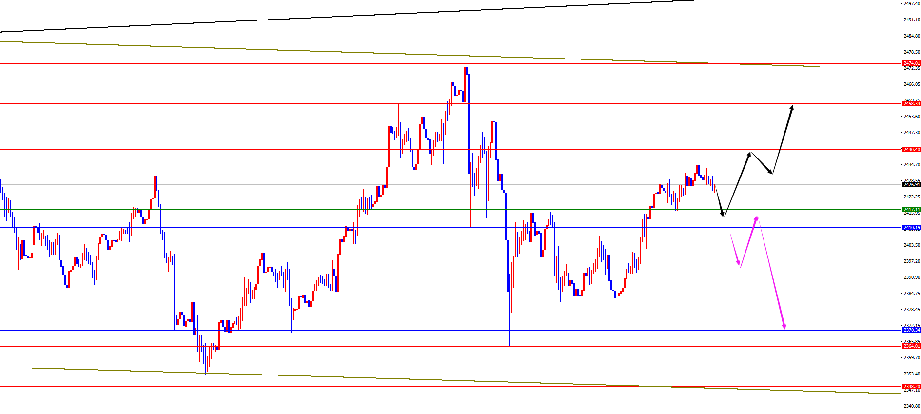 黄金2417-2418区间多,防守10美金,目标2440-2450-2460(2410为周内多空分水岭)