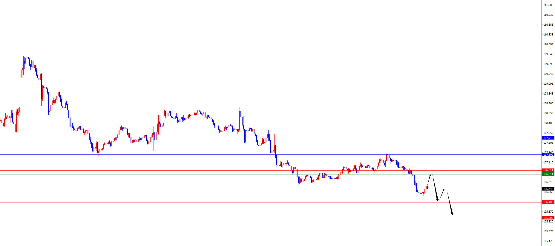 美指106.80-90区间空,防守5美金,目标106.10-105.70