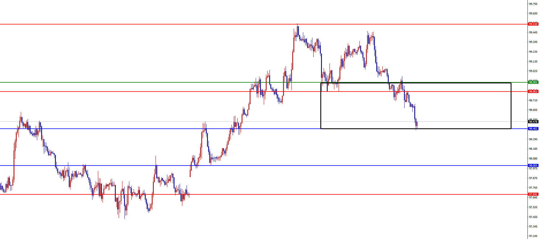 从多周期分析,周线价格经过前期持续震荡后于上周进行站稳,目前周线支撑于98区域,后续关注进一步中期多头(需要注意缺口位置)。从日线级别看,随着时间的推移目前日线支撑于98.40区域,此位置是波段走势的关键,价格目前已经触及,关注今日收盘表现。从四小时上看,在周二价格晚间进行跌破四小时支撑后,价格短线偏承压修正,这个也是我们在周二强调的重点,价格目前已经如期承压测试日线支撑区域,目前四小时阻力于98.80-90区域,后续价格只有站稳此位置才会继续发力上涨,否则短线还是偏空(谨防价格进行回补97.70缺口区域)。一小时上目前价格依旧处于偏空表现,但是需要注意日线支撑的反弹。所以综合所述,目前价格在98.80-90之下短线偏空,只有上破站稳才能看多头表现,大家一定要注意市场节奏)