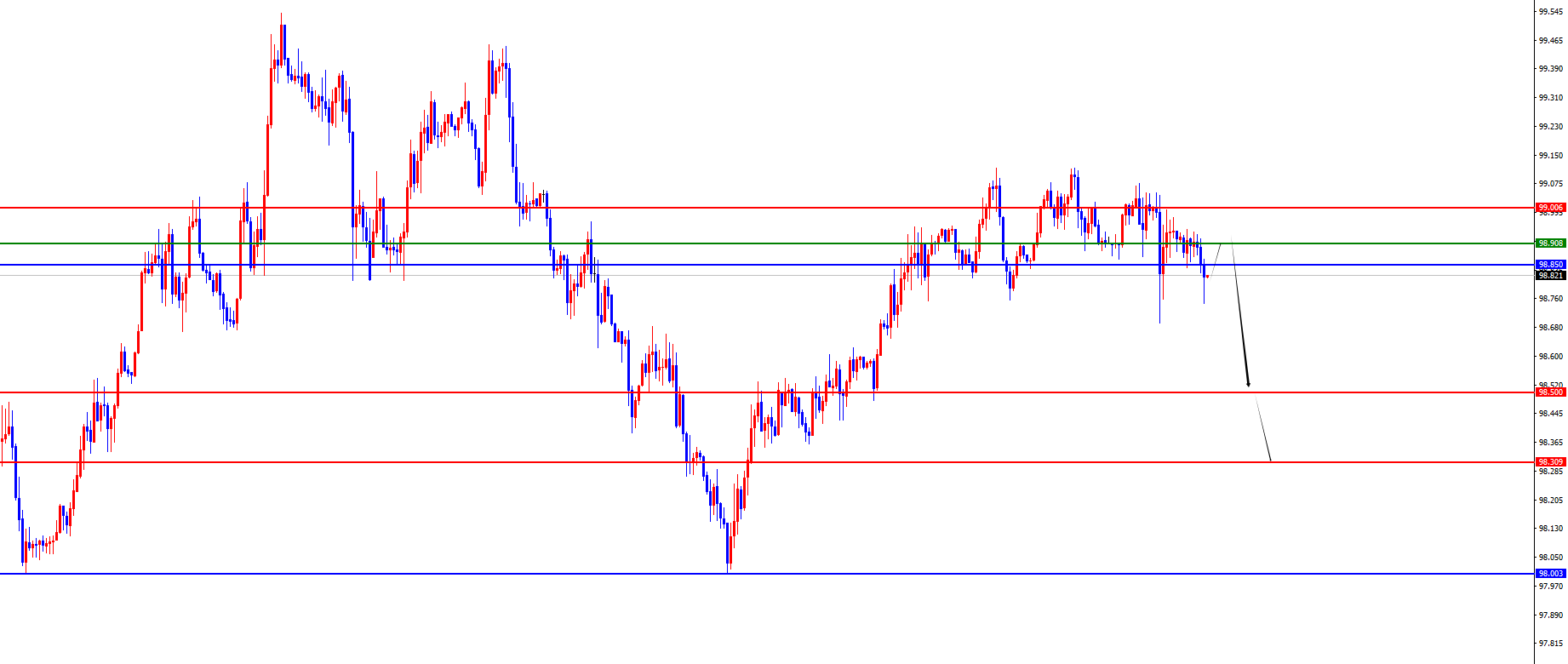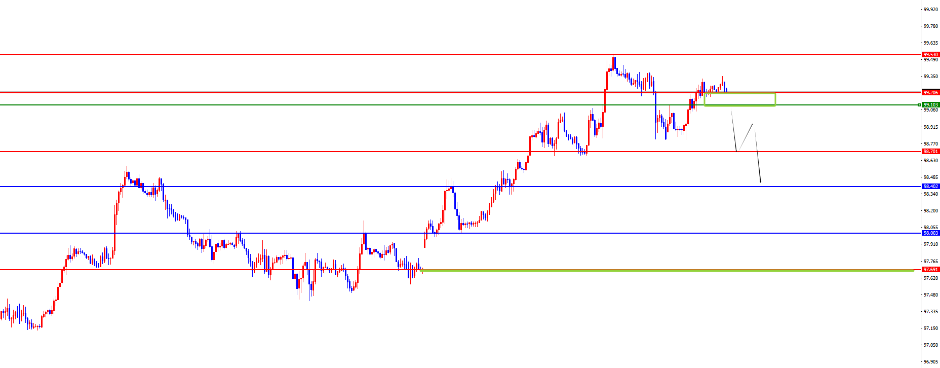 美元指数 在美元指数的表现上,上周五美元指数呈现出下跌的态势。当日美元指数价格最高攀升至99.443的位置,最低则下探至98.807位置,最终以98.81的价格收盘。回顾上周五市场整体表现,价格在早盘期间承压于前一日高点位置,之后持续承压,并且于美盘后跌破四小时支撑位置,则短线偏承压,同时日线上大阴收尾。