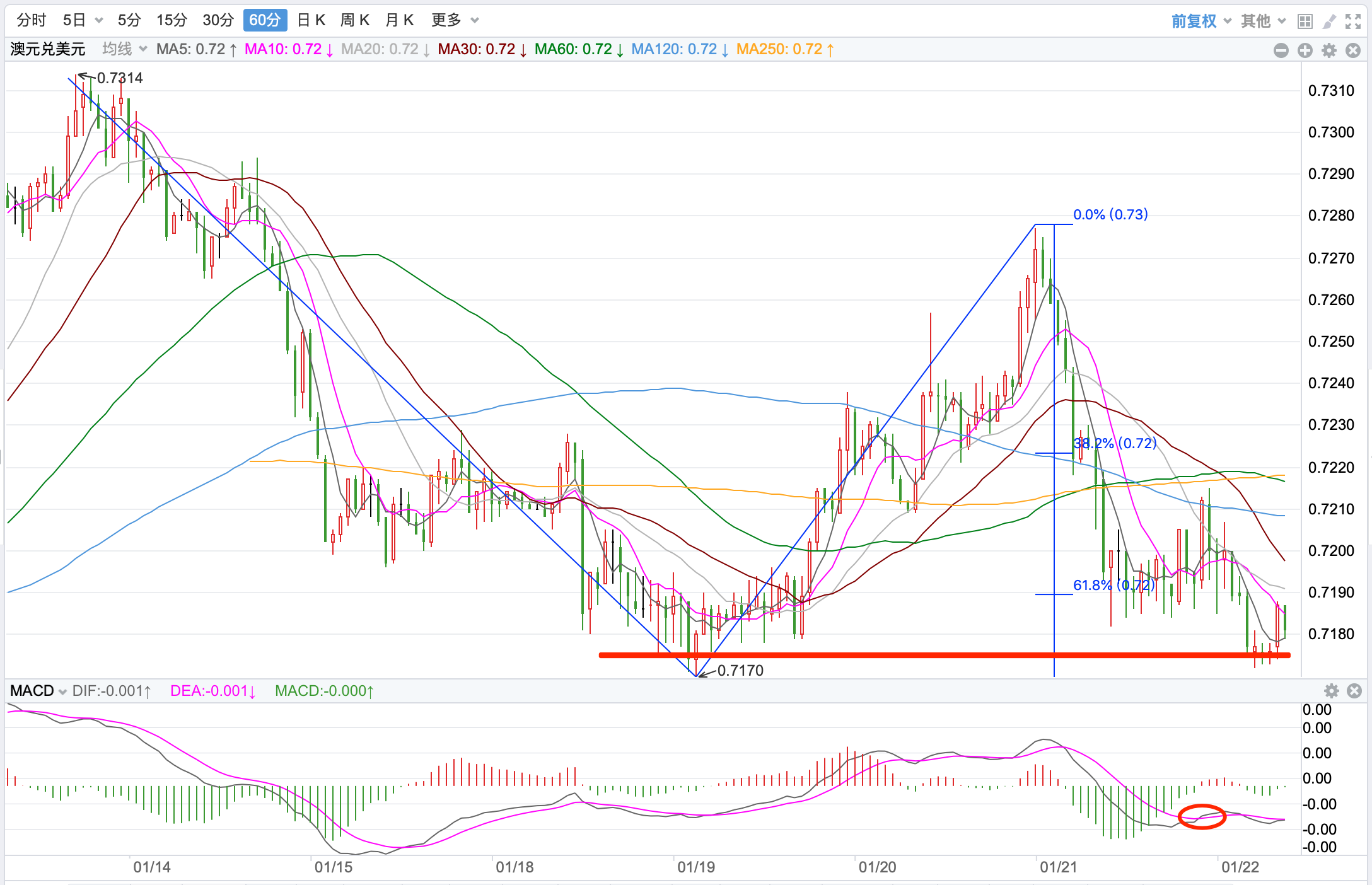 前期自2020年3月底企稳1.0635低点开启上涨走势;2021年1月触及1.23495点的高位后持续震荡下行。2021年11月跌破60周MA均线支持,中长期多空分水岭的支持跌破,行情处在回落调整的下行走势中。当前日内短线行情有继续向下的趋势。