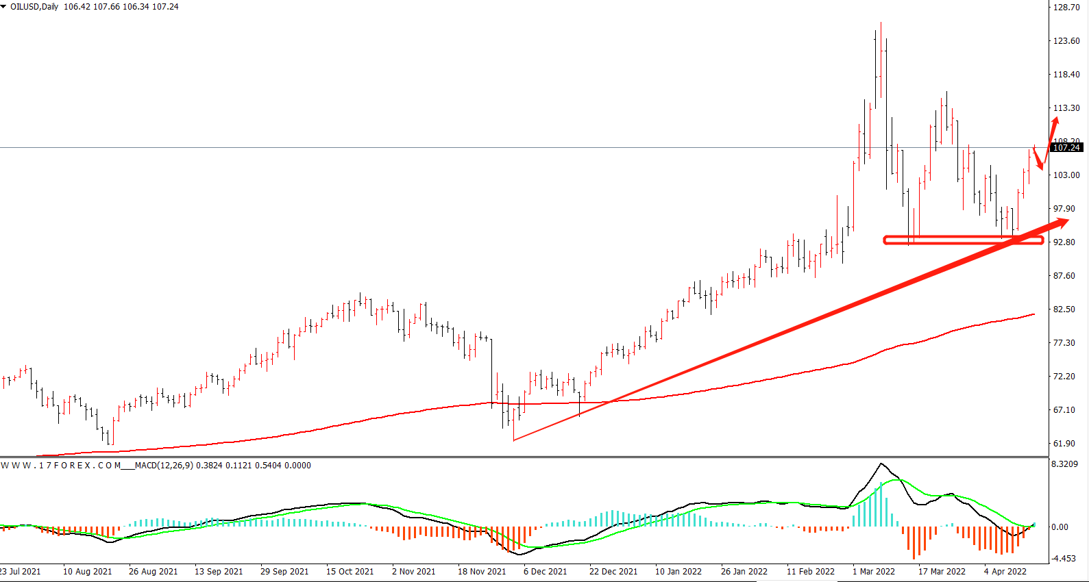 原油在2021年底全球经济大复苏的推动下需求大涨,支持价格走高。2月24日俄乌冲突震惊全球的突发事件影响下持续上涨,3月7日油价上涨至133.460美元/桶的近年新高。此后随着战争进入相持阶段,油价开始震荡走低,目前围绕90美元/桶的位置构成多空分水岭。近期短线震荡测底的走势,当前日内短线有反弹的趋势,上行阻力在110美元,下行的支持在104美元附近。