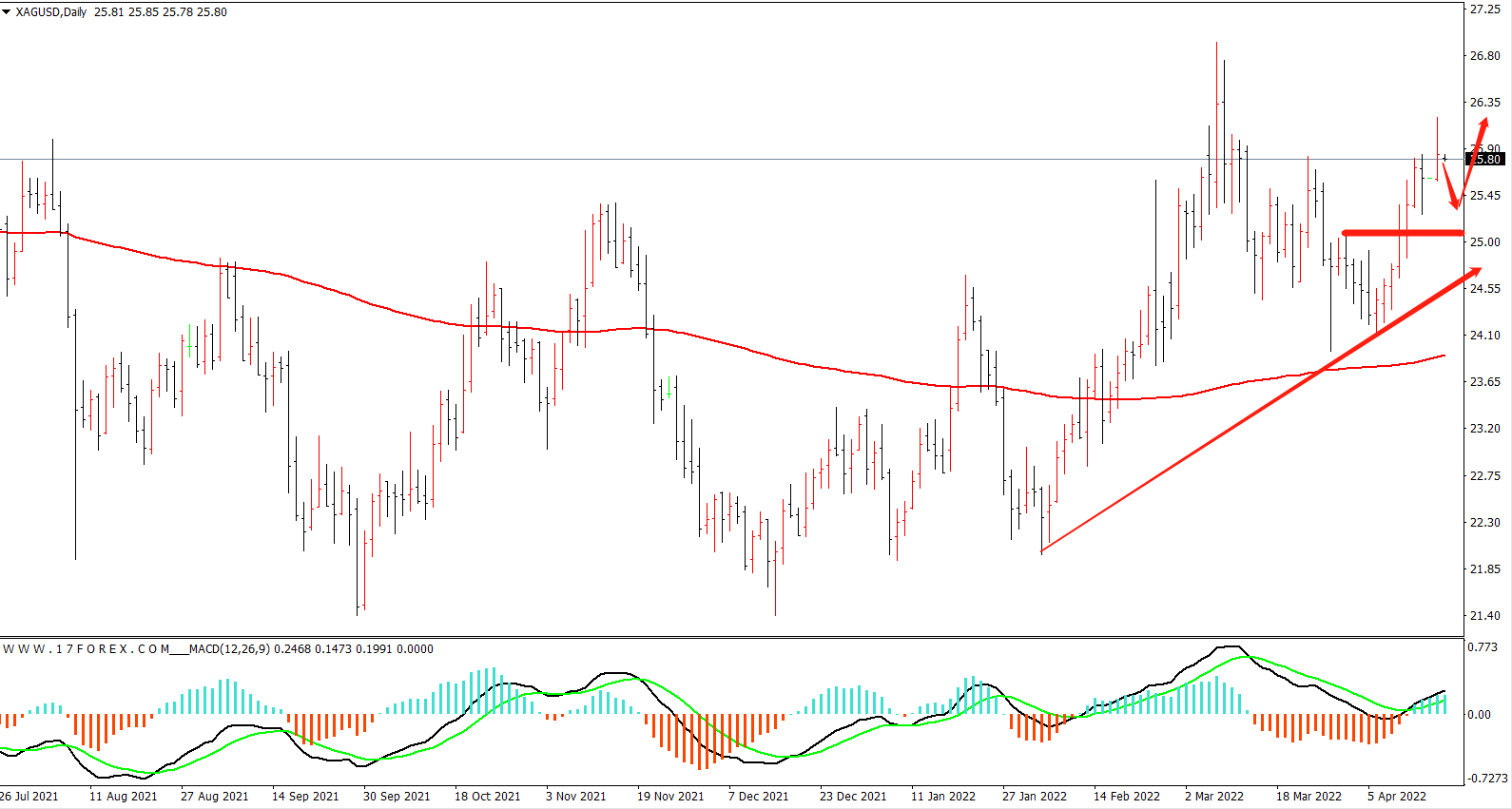 银价从19.64/盎司附近大幅下跌回落,创出五年来的新低到11.29美元附近,随后价格一路反弹上行,两次上涨达到30美元后展开回落。目前整体价格在MA200上方运行,MACD指标企稳弱势震荡,250均线突破企稳打开上行空间延续上涨。近期关键支持是25.00美元,上方关键阻力26.85美元附近;日内短线有向下调整的趋势。