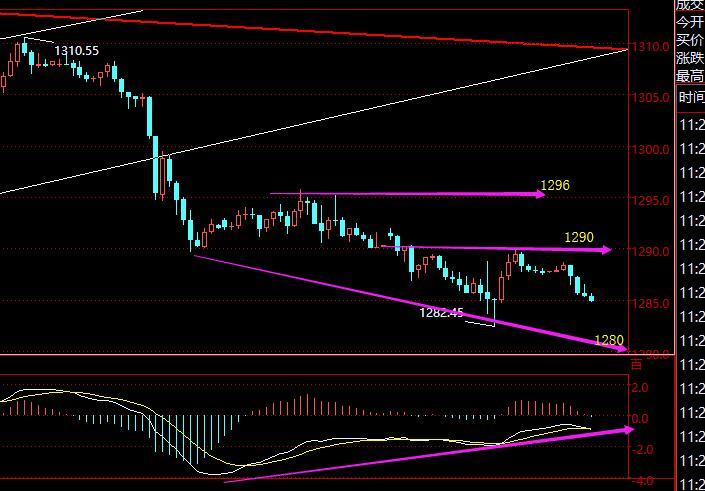 昨日亚欧盘先进行一波续跌,美盘触及1282后迎来一波反抽,不过力度上并不大,虚破1289美盘前开跌口,今日重点还需继续关注1282-1280底部关键支撑,阻力应该是1290,有效突破站上1290才能止跌走反弹震荡;从小时线指标看存在反弹需求,短期支撑1284-85,日线形态还是偏空,短期均线死叉,就算反弹到1293死叉点预计还会进行一波回测,因此1290上方受阻高空为主,1280-82逢低支撑做多为主,继续区间内整理;