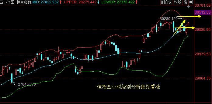 恒指本周周一大跌周二大涨,恒指走势真的是叫大变脸的行情。日线周二一根大阳线,周二开盘高开之后低走至29600关口获得支撑触底反弹上行至30000企稳,最高昨日港指最高涨到30162高点,最终收盘也是收在30100上方。日线级别恒指涨破五日和十日均线上方29800压制破位上行至30000上方,日线运行在布林带中轨,布林带开口缩口上涨。实时策略会在yy8后面8s8给出日线昨天大阳但是周一大阴,一阳一阴也不能说明多头企稳看涨还得从今日走势来确认指标方向。四小时短线分析恒指也是运行在布林带中轨,布林带开口缩口上扬。四小时级别中轨张口上行,上方空间还有待上涨势头。附图MACD在零轴上方死叉运行,绿色动能柱,指标弱势减强。四小时级别涨势今日来看还有新高刷新,日内恒指开盘低开的后选择在29900一线直接布局多单,回踩恒指今日低多思路去操作。