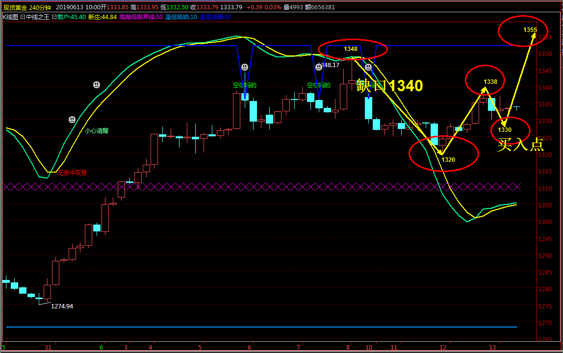 3、激进者1355附近直接多单开进遇1350附近补仓目标1357-1360(激进操作现价即可经常捕捉利润无需等待)