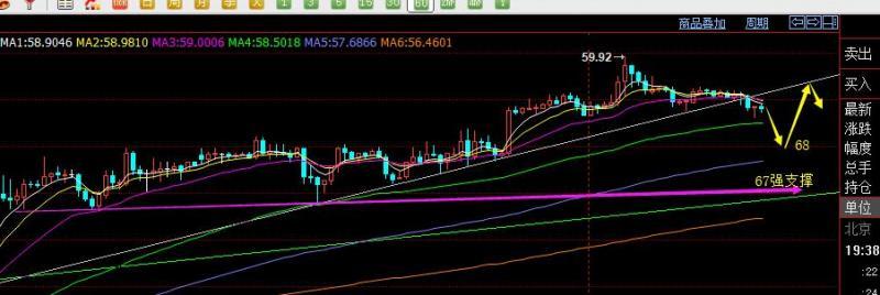 原油隔夜冲高回落,今日白盘压制59.2回落失守了趋势支撑,且4小时也收盘于10日下方,这样短线而言有进一步下调的风险,关注日线5均线58-58.2逢低企稳的机会,从后市来讲,黄金依旧会保持67上方中线看涨,60.2-60.5关键位置一旦突破站上,后市将可能再一次冲击67前高点,而这个上涨应该要借助接下来7月份欧佩克大会对于减产进一步延续的支持才行;