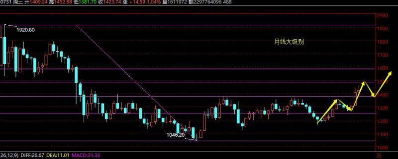 简单从大级别解析下,以月线图为例,价格从前期1160第一波开始起涨,上行至1347结束,涨幅187美金;第二波从1266起涨,上行至1453,也是涨幅187美金,从AB论来讲,1453出现一波杀跌的确正常,也是技术压制获利抛盘导致,但从波浪论来讲,目前进行的是第三上涨浪,而第三浪一定要最长,结合月线分割角度,本月回测确认0.382支撑后继续反抽上涨,上方就有望试探50%的位置,也就是1480,因此短期内来讲黄金1453一定不是高点,起码会测试1480再来做决断;那么有了大方向的思路,短线做单就清楚了,坚持低多原则即可,总会迎来再度的暴力上涨;上周五杀跌回测最低点1420,刚好处于618分割支撑,这也是原本睡之前要挂的低多位置,考虑到一直等到半夜1点都无法触及,就取消了挂单,最终完美的触及1420进行了一波反弹,今日亚盘围绕1431-1420区间横盘,只要美盘前不跌破1420,晚间会回归一定的强势上涨,因为前期是处于一波上涨,短线回调不延续,就是结束的时刻,1431-32若突破站上,则会走强再次靠拢1440;