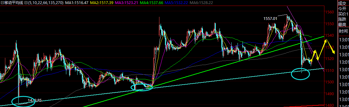 #黄金亚盘解析#前日黄金刚偏强拉升突破前高,创下1557高点后,昨日就接到贸易消息,避险大大减弱,造成黄金大幅跌了将近50美金,近期单日下跌最大的一次,一次较大的洗盘,扼杀了市场大部分多头,现在市场面较多的声音已经呐喊“转空了,空头来了”其实这样的大洗盘走势之前也发生过类似,7月1日和8月13日都是上涨过程中直接大跌砸盘向下,但之后的走势发现仅仅只是一日游而已,震荡盘整数日后,继续多头破高上攻,因此前期一路单边上涨后,出现一天的大阴不足以改变趋势,只能暂缓它,并且从周线级别一看就知道还是多头,只是高位围绕短期均线震荡修正;那么短线来讲,隔夜小时线弱势跌,凌晨压制1522横盘,今日亚盘下探1512.5就出现了一定反抽动作,离笔者预期1511做多点略差些,午后关注1522,一旦突破站上,起码今天是一个震荡格局,一定不是极弱延续的下跌,而关键压力在1528和1534这两个位置,一个是小时线大阴顶端位置,一个是昨日下破的顶底位置,反弹这两个位置再去高空,做区间内的修正;短线1511上方是存在趋势支撑的,不宜低空