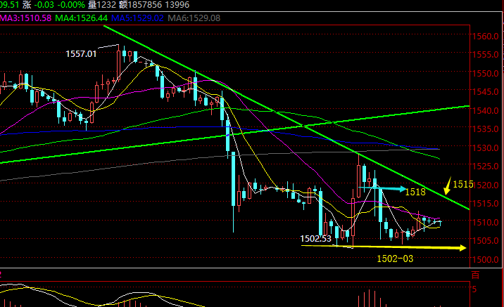 经过上周四周五连续两日的大幅不断洗盘后,短线价格步入了一定弱势格局,周线连续两周收报倒锤头阴K线,也促使价格步入了一定时间的整理修正,不过中长期多头趋势仍旧不改变,只是需要更多的时间来震荡酝酿下一次的破高,那么在本周操作上周初要以区间震荡多空操作,在关键的重要支撑上1485-1476区域一定是做多布局,不要追空,此区域是考虑中线多单布局的参考点,具体解析思路周评中已经发布,今日早盘开盘先下探一波,但仍旧支撑1502不破,故盘中给出1506-05多单,成功抵达1512-1511盈利点,1512作为5分钟存在平台阻力,突破才能冲击1515-1518关键的压力区,只有这里突破,才能短线变强继续试探1528上周五高点,若是如此,价格就结束下调继续转多发展了;当然,市场上一般不会这么顺,连续两日的大幅下探,想要再上攻一般修需要几天甚至一周时间来震荡酝酿,要有想象力,但要有一个度,现在的支撑只关注1507,重新破位会走弱去1502-03,甚至破位1500下方,而阻力是1512,站稳早盘高点才能试探1515-1518,也是上周五跌幅的618分割关键点,同时是趋势压制点,过不去再去震荡高空; 操作上价格低位尽量规避空,低多为主,价格拉升后受阻就不去追多,只有1512站稳才能考虑回测继续多;