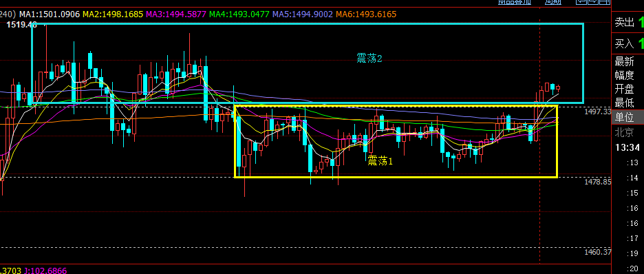 昨日黄金欧盘连跌向下,却破位1490关键支撑风水岭,但美盘并未二次延续下跌,在德拉基讲话以及土耳其事件,半夜还有美国总统“嘴炮”各种避险刺激下,黄金突破了1498.5两周以来的震荡平台阻力,冲击1504高点,暂时打破了一定震荡格局,日线收盘价也略破关键趋势通道上轨压制,对于今日来讲需重点关注几个方面:第一,日线阳线破趋势阻力,能否延续是关键,决定下周布局;第二,前期1498-1478震荡了两周时间,昨晚突破后,并不认为会直接走多头趋势,因为周线均线死叉平行压制不太支持,反而后市继续拉高存在主力诱多陷阱,但既然突破1498,即便是震荡,也会暂时维持1498上方运行,后面的集中压力要关注1510和1520两个位置,不认为会上破1520去走强,认为震荡的区间会上移1498-1520之间,此区间内可能还会反复的运行;第三,隔夜依托1497最后拉升,也是顶底转换点,此位置是今日的风水岭,想要震荡走强延续,这里一定不能失守,一旦下破又将回到原先的震荡偏弱内,因此今日可1497依托这里逢低回测去跟多;