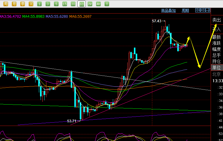 近期节奏把握不错,主要是技术上走的很规范,思路就一路符合中,上周五大阳反攻,昨日指出回测先多,白盘给出55.5多,可惜只触及55.8就偏强连阳拉升,欧盘强势,晚间回测56.5提示二次看上行,又可惜触及56.6略差一点就拉升到了57.4,而57.4是分割压力,也是前期压制点,同时56.4顶底位置并非修正到位,因此给出57.4下做空,顺利止盈于56.4,只要走势符合技术判断,耐心等一般都会有利润可抓;日线昨日收盘上下影线一致的十字K,处于大阳后,且十字K低点处于大阳实体一半上方,表明后市维持看上行节奏,还会继续破高,下滑只是短期的回落修正,均线也是保持多头排列向上,今日回测55.8及下方都是做多的时机;另外,收盘前小时线级别大阴回测,第二天先反弹就是诱多,以大阴顶端位置56.9-57先触及可空,下方4小时10日支撑是56.2-56.3,也是日内早盘的低点,提前失守这里则跟空进去可以见55.8,极限55.5,这两个位置或55.5-55.8区域一旦企稳就立即做多,可以再度看57上方;