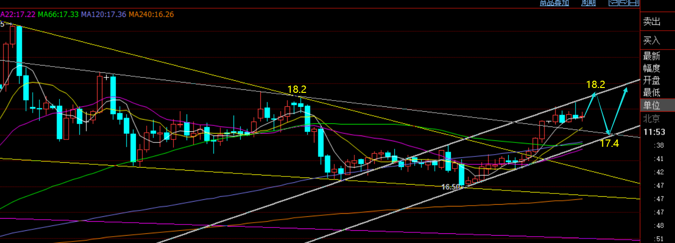 从日线级别上已经开始了高位箱体整理,暂缓了强势的上涨,按照目前新的通道看,阻力在18.2-18.25,支撑17.4,此区间会震荡几天时间,可围绕它去高抛低吸,做波段布局;短线来讲,继续关注17.7,守住不破,还是相对抗跌,会继续测试18.1,乃至18.2;
