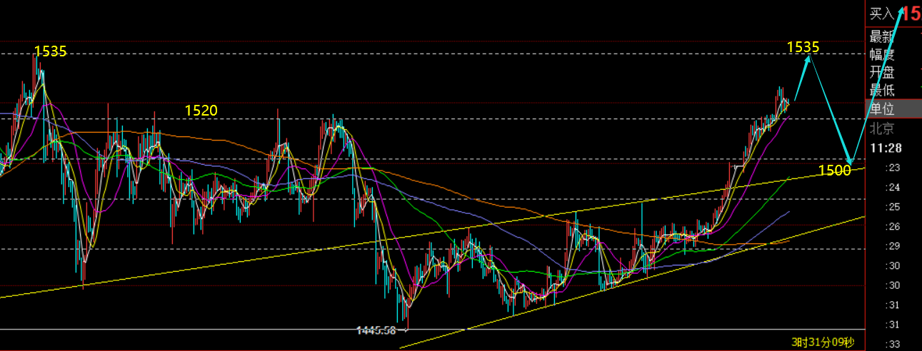 周二黄金尾盘压制1525冲高走跌至1417,日线收报较长上影K线,也是顶部射击之星压制形态,这说明1525开始压力加大;不过,由于1477起涨至1525这一波属于较强小单边,暂时不会马上走弱,中途至少会有区间震荡的整理过程,而整理过后再往上最后一拉才有可能短期见顶压制走一波回测,修正前期的涨幅;周线级别由于大阳的出现,结束底部1488-1450几周以来的震荡,那么前期预期的诱多下跌1470及下方就基本不存在了,极限回测调整的位置是1488顶底位置,也极有可能依托1500会再次迎来多头趋势上攻,长线而言一直维持看涨不变,中期金价也在酝酿多头的发力;从短期4小时macd看,价格已经出现一定背驰,但价格依旧抗跌,那么这说明有可能还会往上拉升最后一次,形成典型的双背驰形态后方可快速杀跌修正,那么突破1525后,上方所重点关注的是周线上轨,同时也是前期开跌口1535,此处是计划小波段做空的位置,可以最大指向1500一线,长线波段做多的位置则是1500,极限1488,分批参与多单,看后市1557得失; 对于今日短线,早间开盘跳空高开后回落,价格开始了1516隔夜低点上方的整理,而作为近期强势小单边,横盘不跌的走势容易继续上冲,因此以1516-1517作为支撑点,直接跟多,看1525的破位,记住一点,突破1525后随时谨慎冲高回落,随时等待波段做空布局;