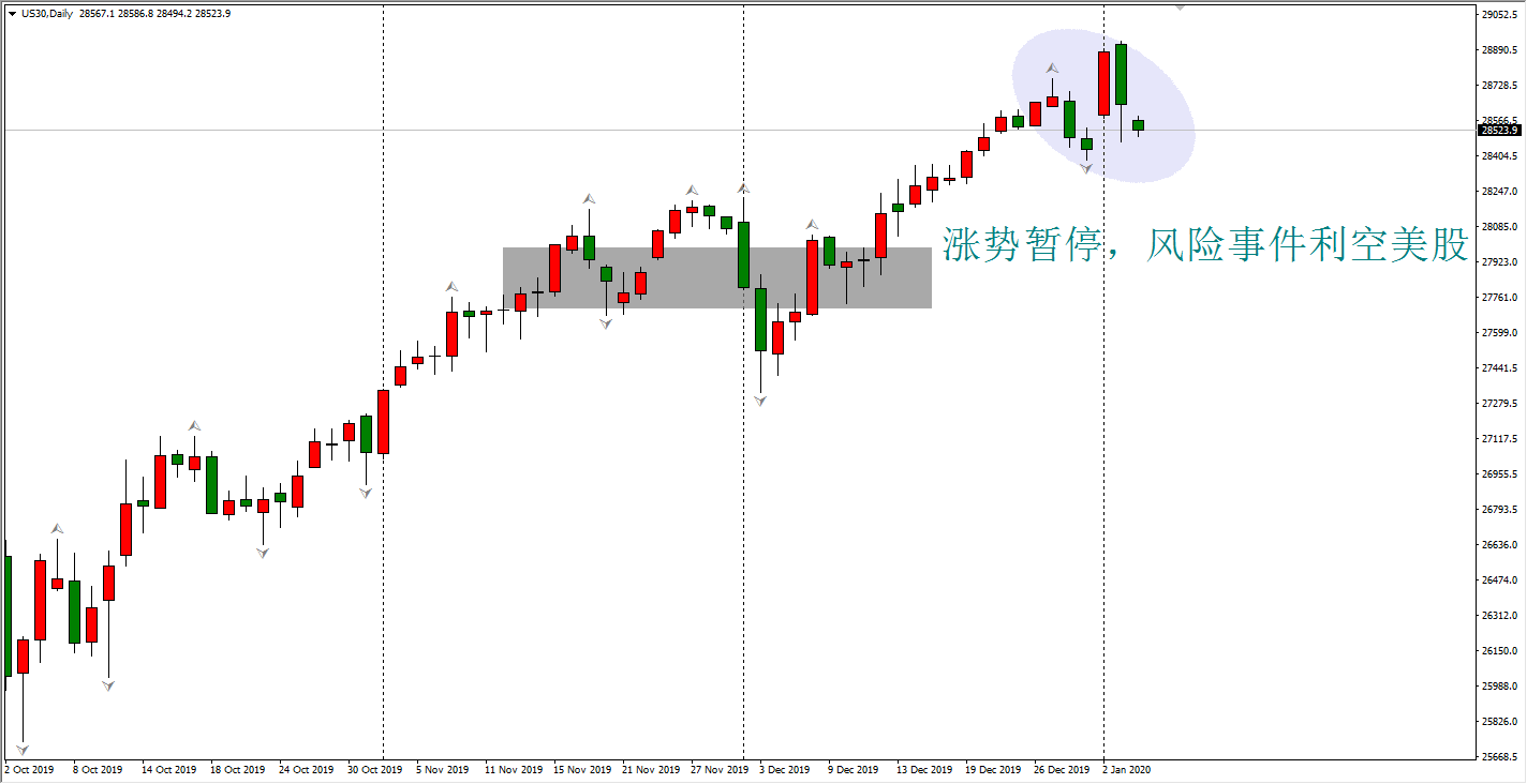 美国与伊朗关系紧张,对于美股来说是利空消息,所以在黄金原油大涨之时,美股上周五收出大波动率阴线。今日预计也将以阴线收盘,低点28387.1被突破概率较大。但是,如果谈论美股的长周期走势,则依旧维持多头观点。原因在于,美股走势虽然会受到热点事件和上市公司业绩的影响,但主要是因为美联储的货币宽松政策。只要美国没有不如加息通道,美股就将保持持续多头。
